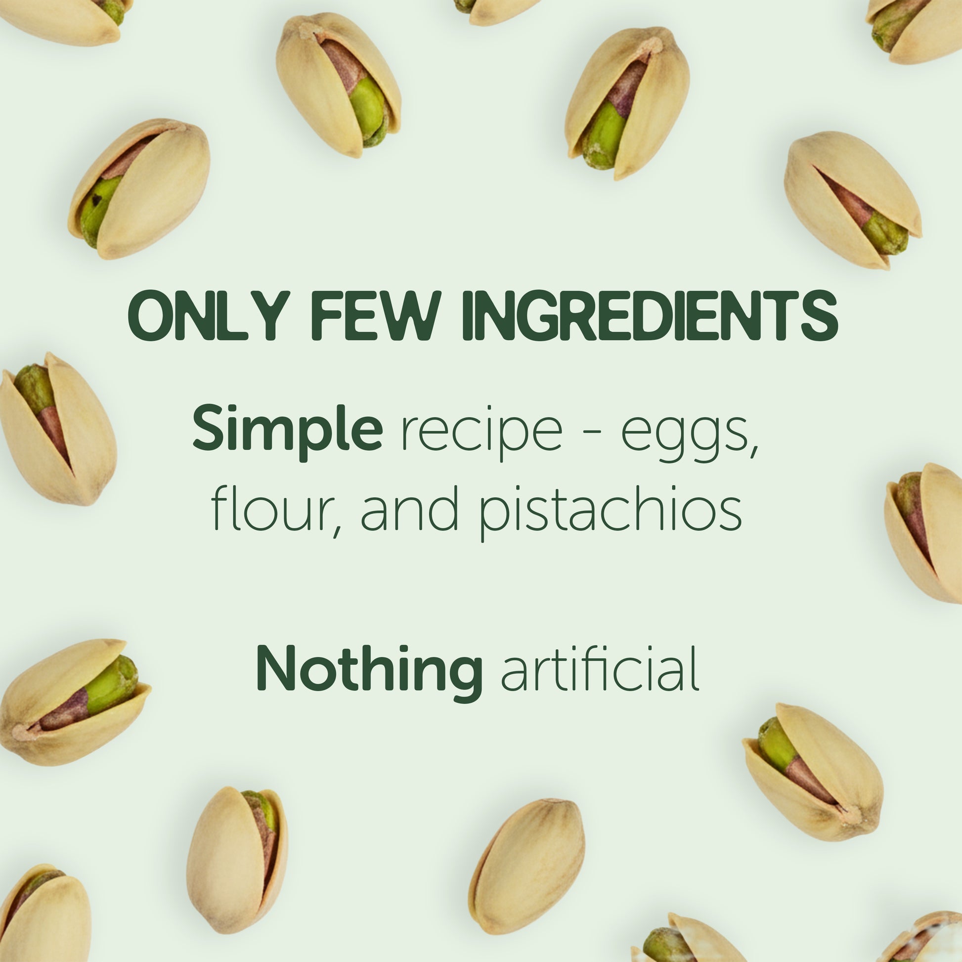 Made with Simple Ingredients - Eggs, flour, and whole pistachios. No artificial flavors, colors, or preservatives - just pure, natural goodness.