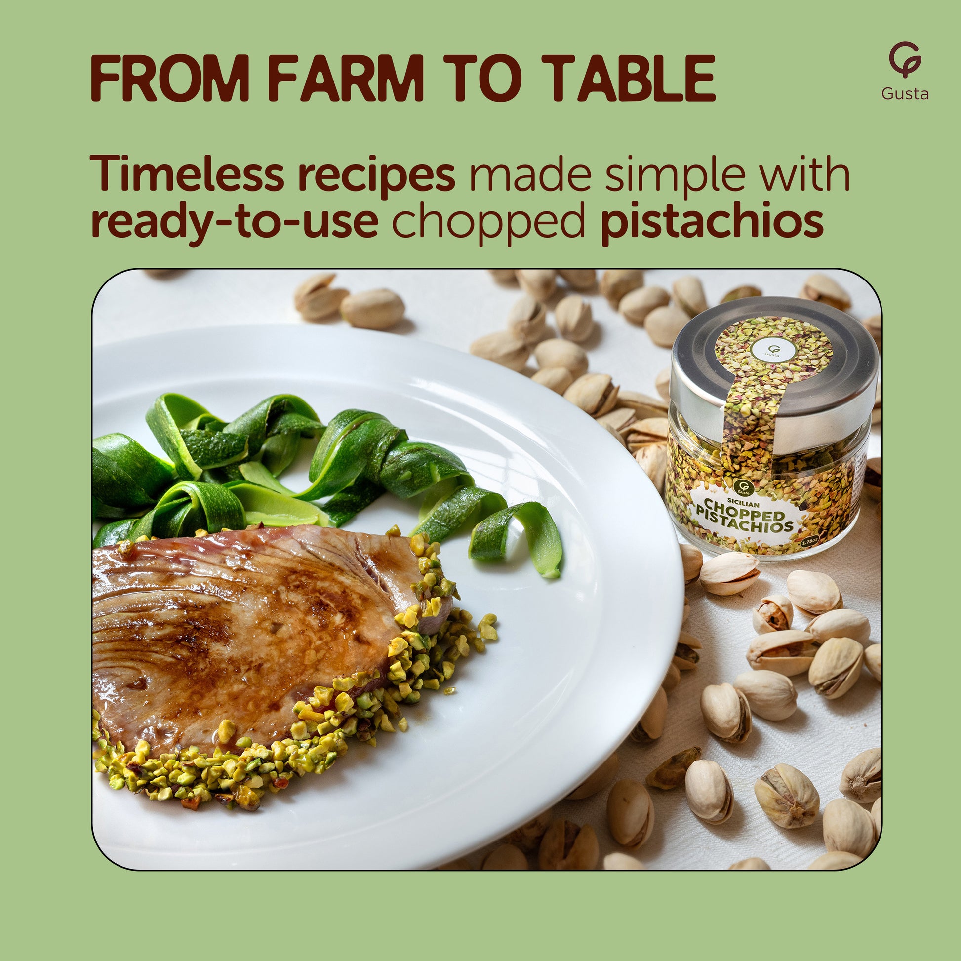 Authentic Sicilian Pistachios - Sourced and produced in Italy, these chopped pistachios deliver a naturally rich flavor and vibrant color, perfect for elevating both sweet and savory dishes.